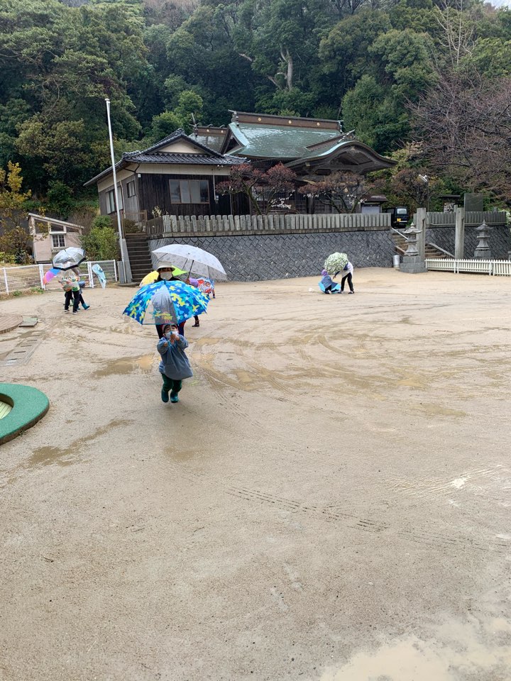 そして帰ってからは、傘をさし、長靴で園庭を探索。水たまりをべちゃべちゃ!したくなるよね~!年中さんは水神社まで行き、いつもと違った雰囲気を味わっていました。