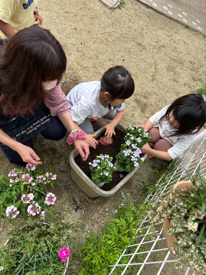 そして、「おたすけまん!!」は大人も助けてくれます。園芸好きな副園長が花を植えていると、手伝うよ~と来てくれました。園芸部が出来そうです。